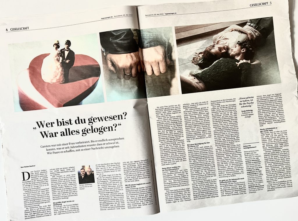 Carsten Dobberkau verheimlicht gar nichts mehr. Er lebt und arbeitet weiterhin in dem Dorf, in dem er als junger Erwachsener Angst hatte, dass er sich dort nie mehr blicken lassen dürfe. Seine Ex-Frau zog zurück zu ihrer Familie nach Mecklenburg-Vorpommern, die Kinder studieren in Rostock. Gemeinsam mit seinem Mann pflegt er seine 90-jährige Mutter, die bei ihnen lebt. „Heute bin ich mit mir im Reinen“, sagt er, „obwohl ich die Last, meiner Ex-Frau geschadet zu haben, ein Leben lang auf meinen Schultern spüren werde.“