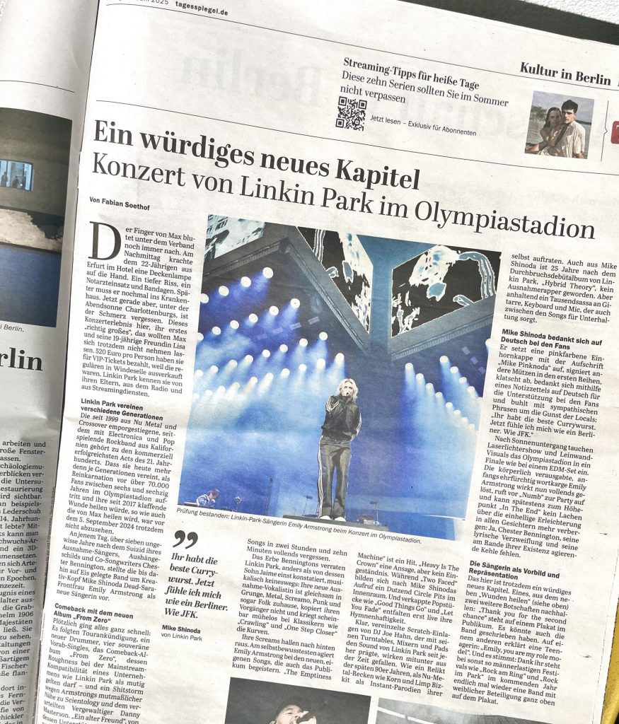 Nur scheinbar Gestriges für die Gegenwart: Acht Jahre nach Chester Benningtons Tod überzeugen die Nu-Metal-, Rock- und Pop-Allrounder Linkin Park im ausverkauften Olympiastadion auch mit neuer Sängerin und neuem Album. Mein Nachbericht für den Berliner „Tagesspiegel“.